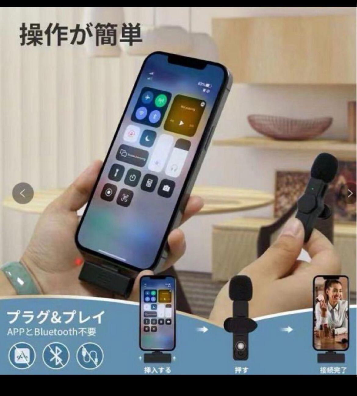 最新技術で送信機と受信機が自動的にペアリングされAPPとBluetoothが必要なく、ligtning受信機を携帯電話に導入し、マイク送信機の電源を入れ、自動ペアする。送信機のライトと受信機をライトが常に点灯している状態になると接続が成功。初心者にも使用可能。