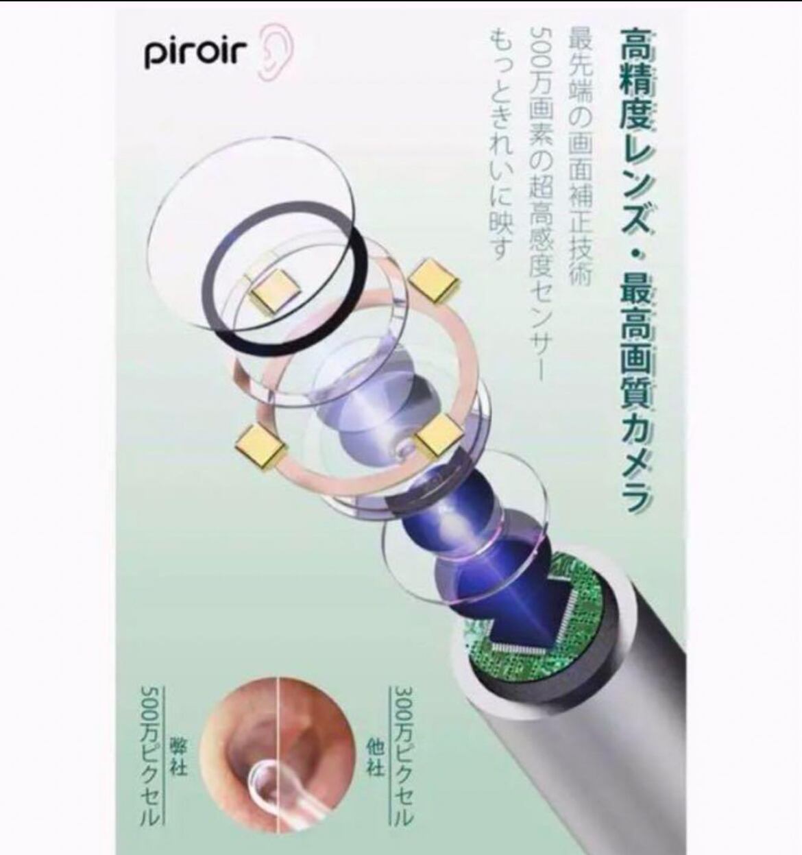 Piroir耳かきの先端に1080P、500万画素のカメラレンズが付き、耳の中の細かい毛、耳クソまで見えて従来の耳かきカメラより画期的に耳掃除ができました。高齢者や子供に適したインテリジェントな視覚カメラ付き耳かきです。極細3.5mmの細さ、どんな方でも問題なく耳にフィットします。